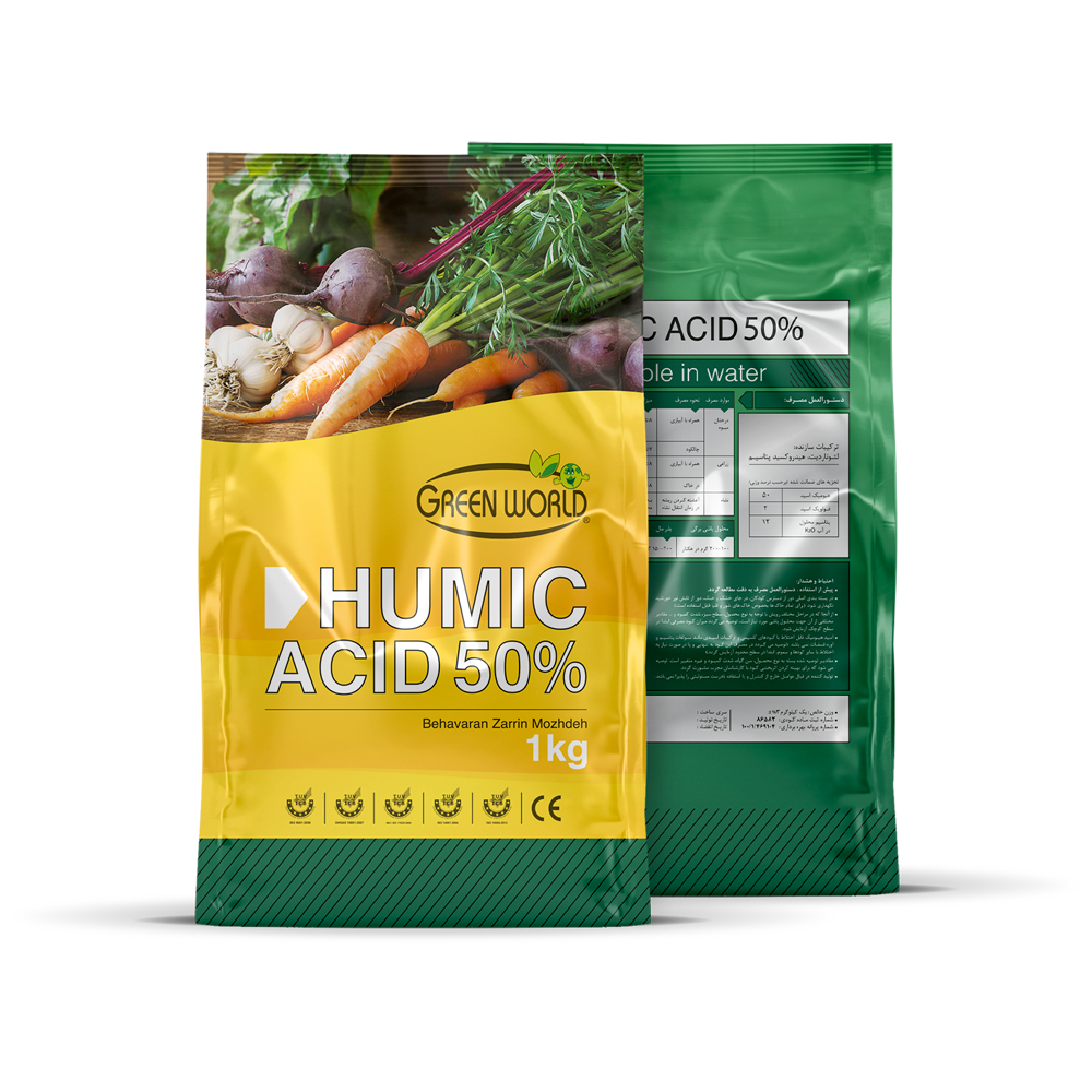 • Green World Humic Acid Fertilizer, produced by Bahavaran Zarrin Mojdeh Company, is a powdered formulation containing 50% humic acid, 10% fulvic acid, and 6% potassium.