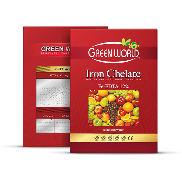 Green World 12% Chelated Iron Fertilizer, chelated with EDTA, is a product of Behavaran Zarrin Mojdeh Company. This fertilizer also contains 8.5% soluble sodium.