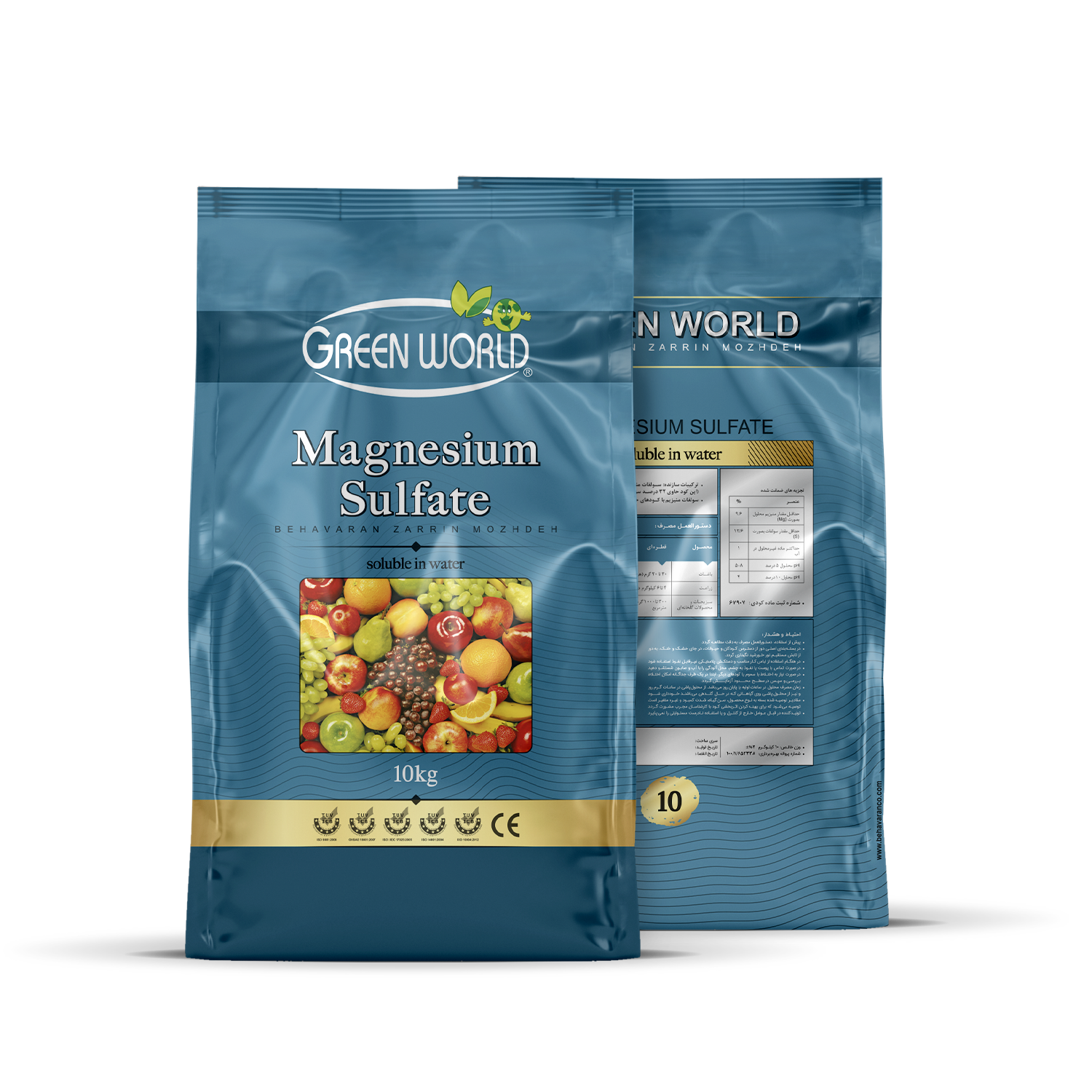 High-quality Magnesium Sulfate fertilizer by GREEN WORLD containing 9.6% Magnesium and 12.6% Sulfate. Improves chlorophyll production, nutrient uptake, crop yield, and plant health. Suitable for foliar spray, fertigation, and orchard application.
